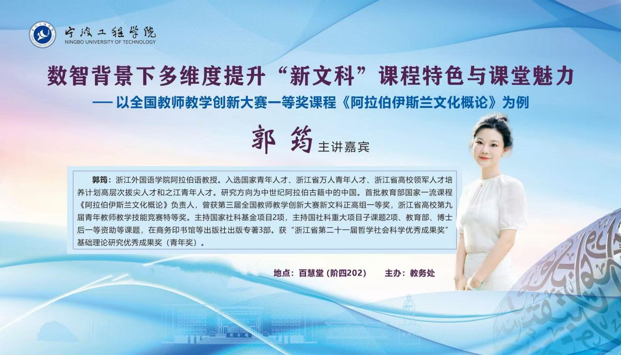 学院郭筠教授来校,作题为“数智背景下多维度提升‘新文科’课程特色与课堂魅力”的专题讲座。讲座由教务处副处长谢行恒主持,全校众多教师踊跃参与。